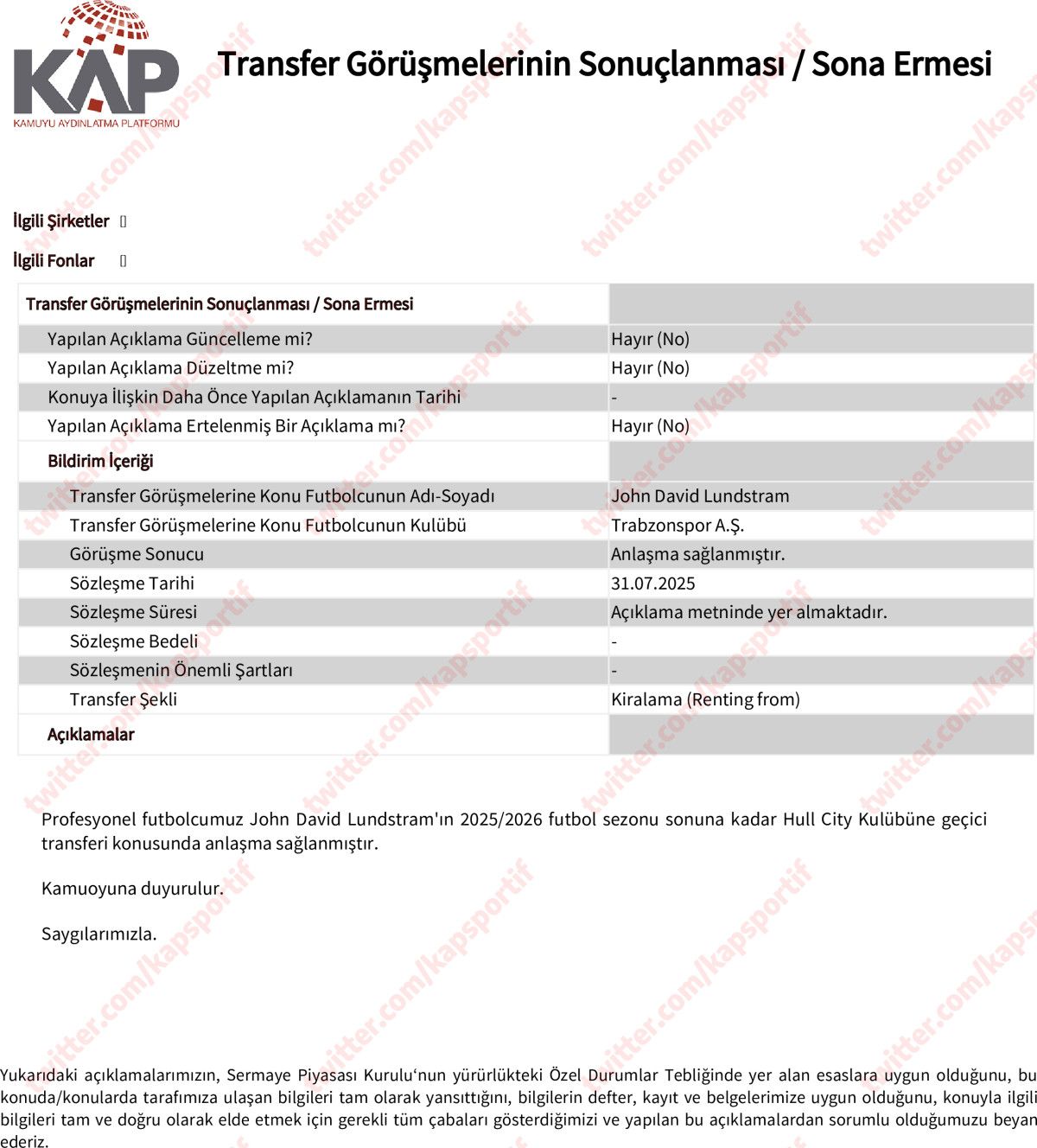 Profesyonel futbolcumuz John David Lundstram’ın 2025/2026 futbol dönemi sonuna kadar Hull City Kulübü’ne süreksiz transferi konusunda muahede sağlanmıştır.