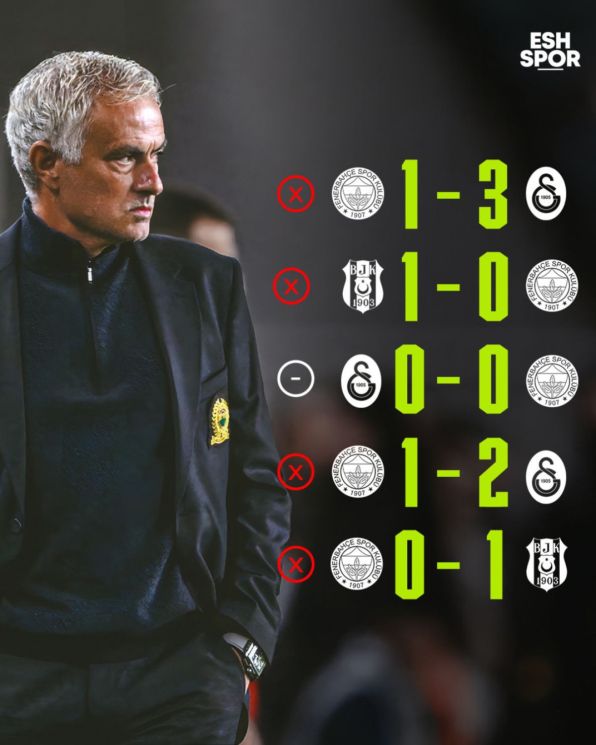 Sezon başı sarı-lacivertlilerin başına geçen dünyaca ünlü teknik yönetici Jose Mourinho, ezeli rakiplerle oynanan derbilerde galibiyetle tanışamadı.