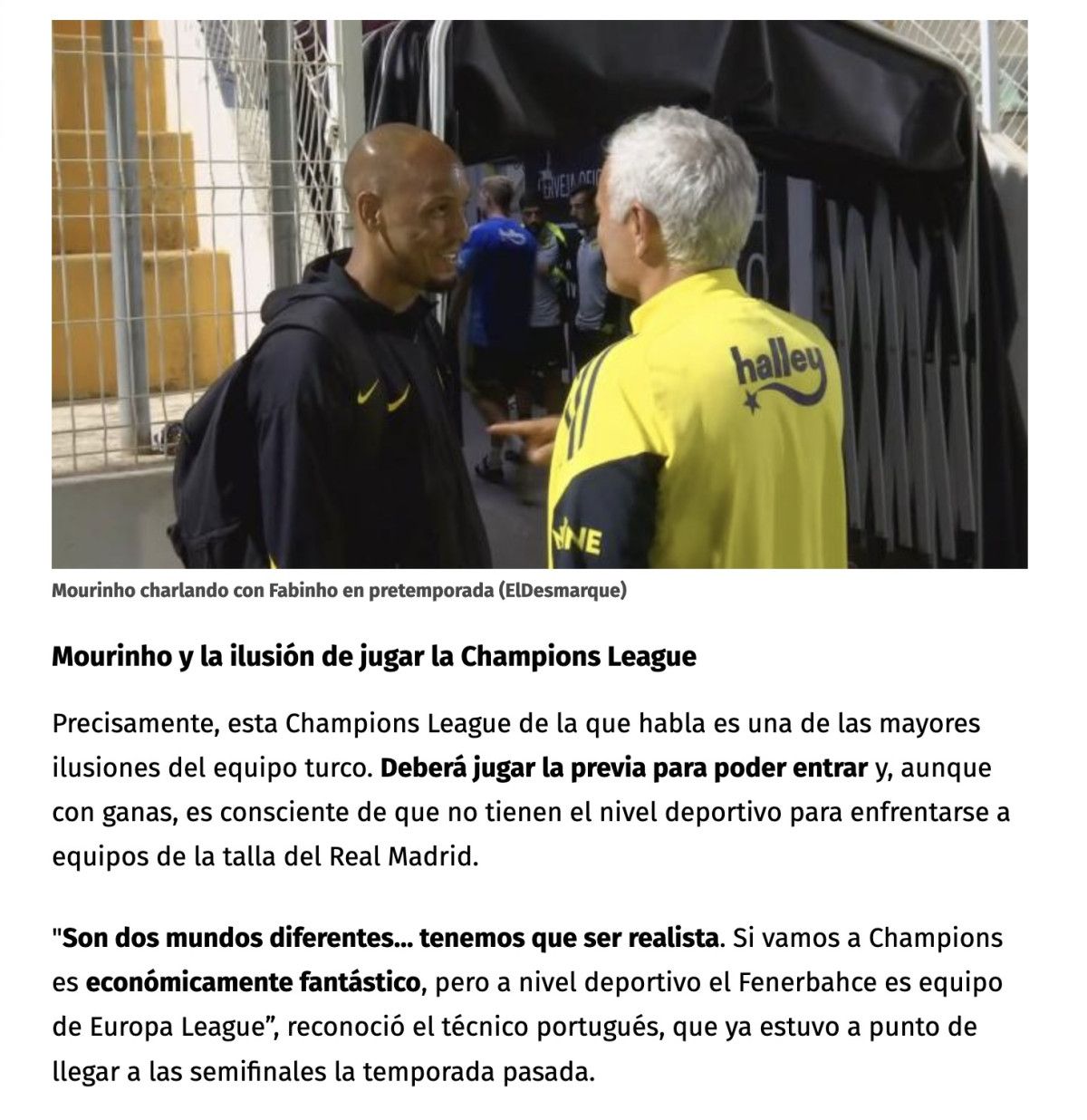 İspanyol basınındaki haberin devamında Jose Mourinho’nun “İki farklı dünya… Gerçekçi olmalıyız . Şampiyonlar Ligi’ne gidersek finansal açıdan kusursuz olur, fakat sportif açıdan Fenerbahçe bir Avrupa Ligi kadrosudur.” sözlerini kullandı.