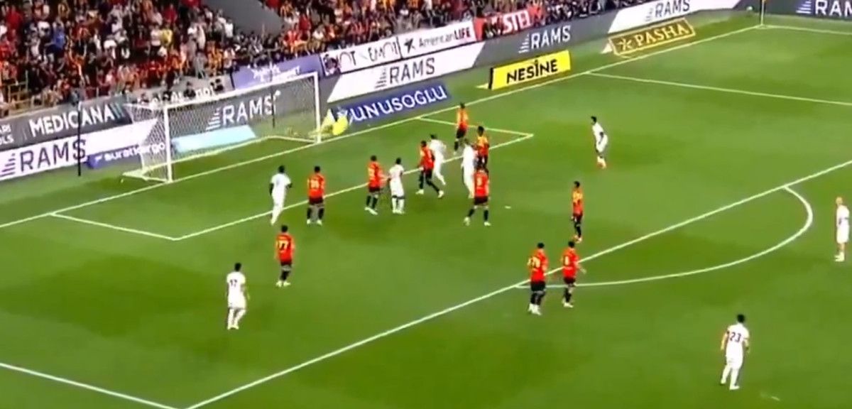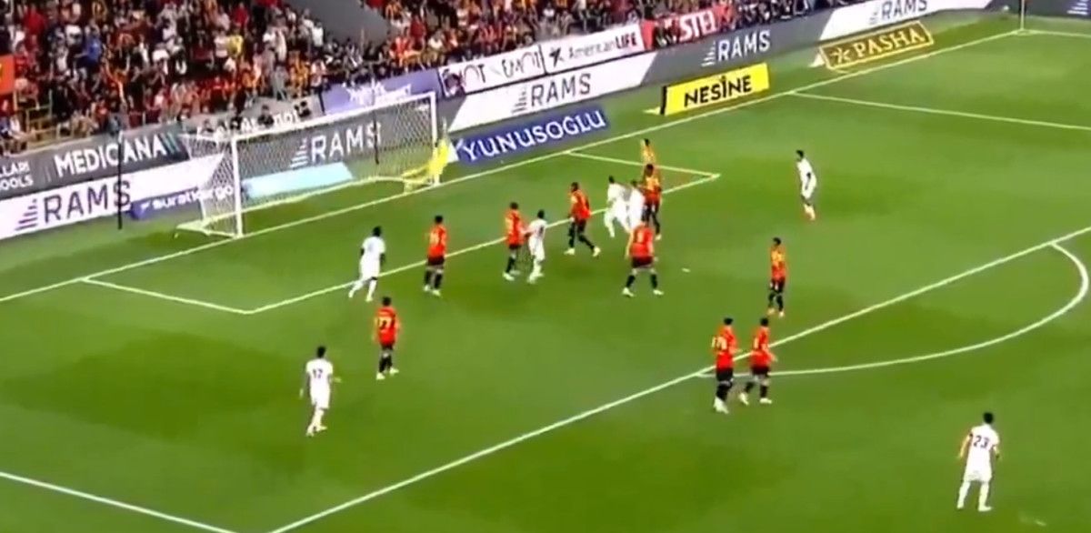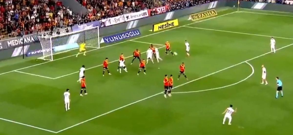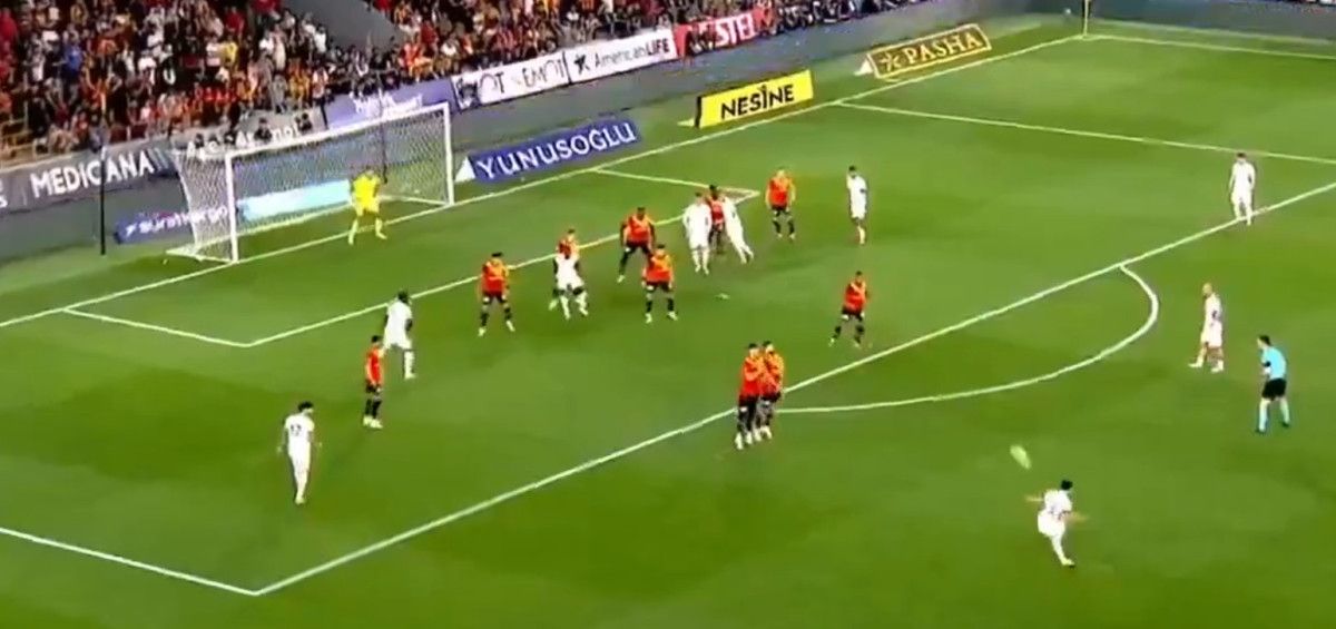 Sol iç kulvardan uzak aralıktan kullanılan özgür vuruşta Kaan Ayhan sağ ayağıyla vuruşunu yaptı, meşin yuvarlak uzak köşeden doksana gitti.