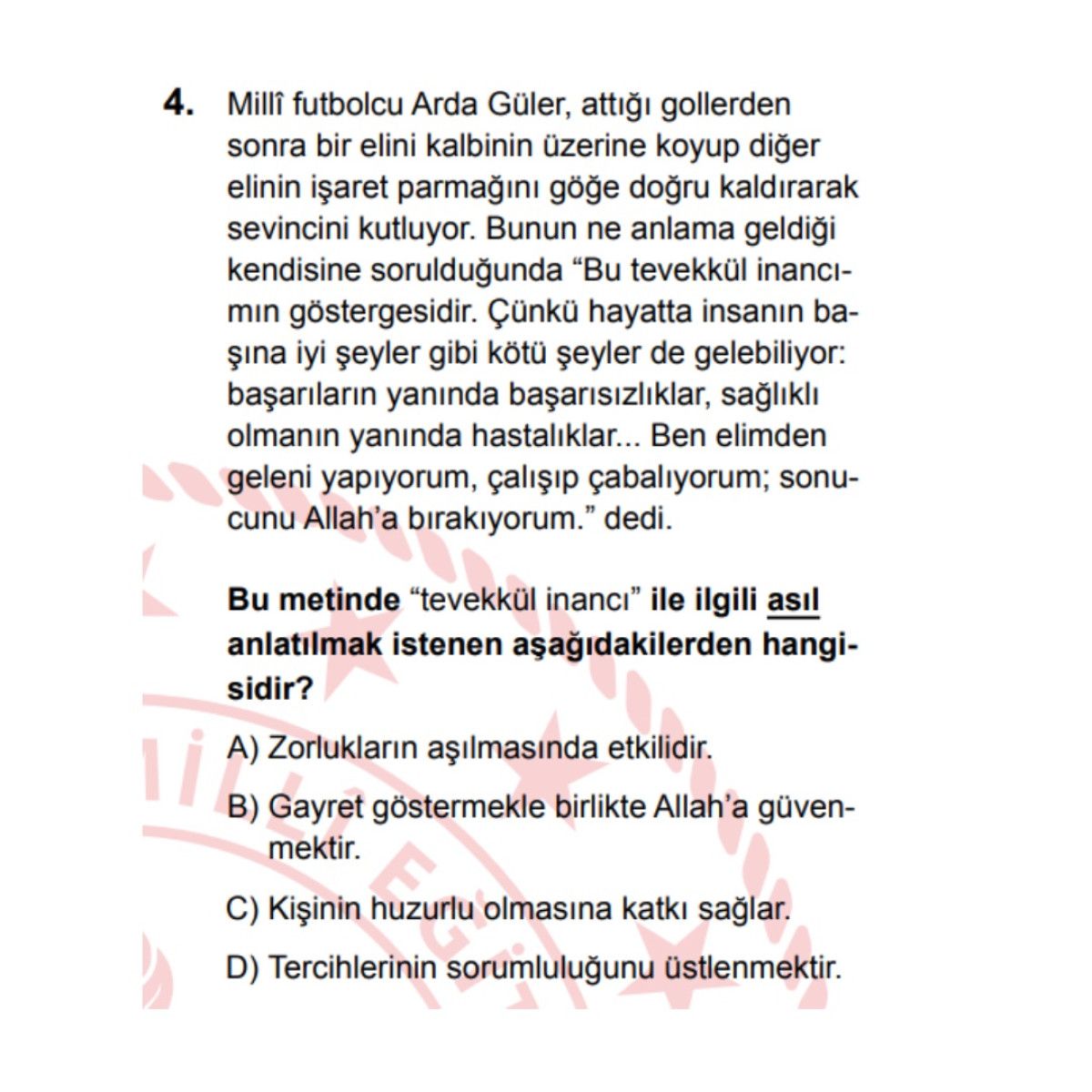 Söz konusu soruda Arda Güler’in meşhur gol sevincine atıfta bulunarak ‘tevekkül inancı ile anlatılmak istenen’ durum soruldu.