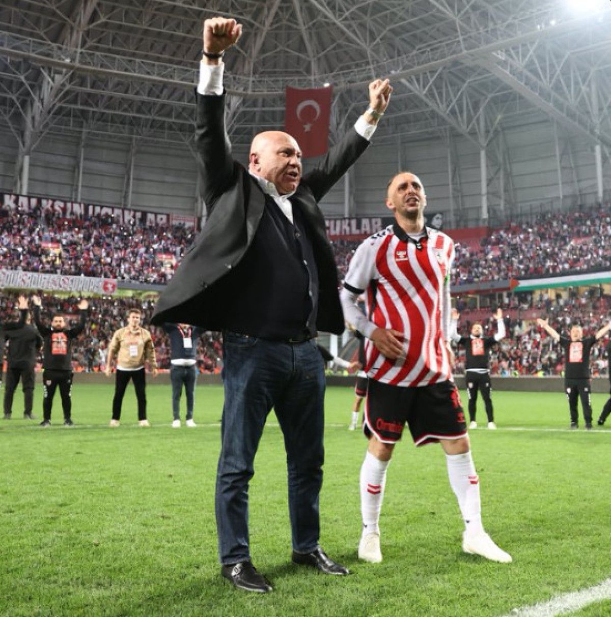 Maçın akabinde Yeni 19 Mayıs Stadı’nda alana giren Yıldırım, taraftarlara üçlü çektirdi ve burada bir konuşma yaptı.