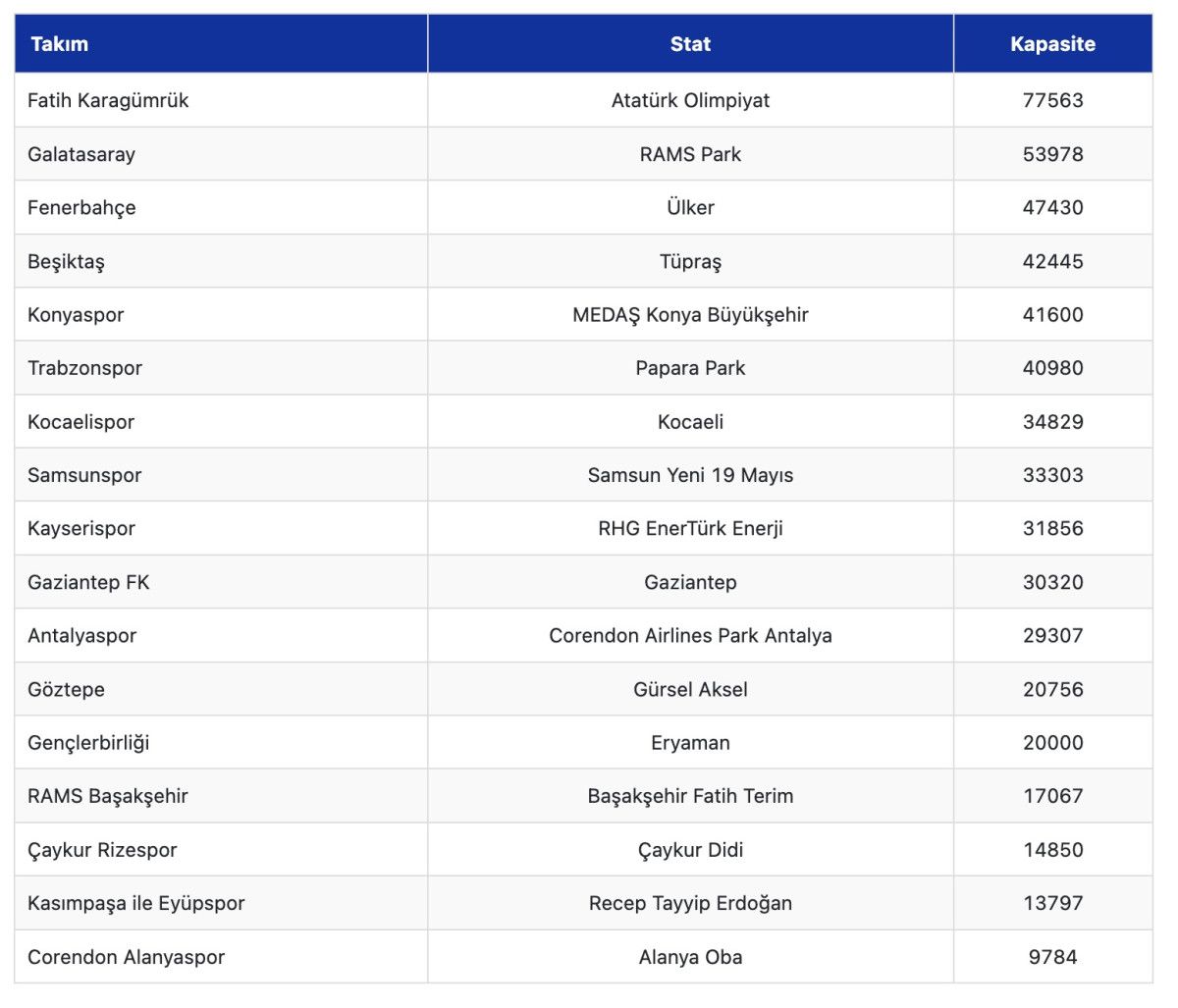 Galatasaray’ın iç saha müsabakalarını oynadığı RAMS Park ise Atatürk Olimpiyat Stadı’nın akabinde en fazla kapasiteye sahip ikinci stat olarak öne çıkıyor.