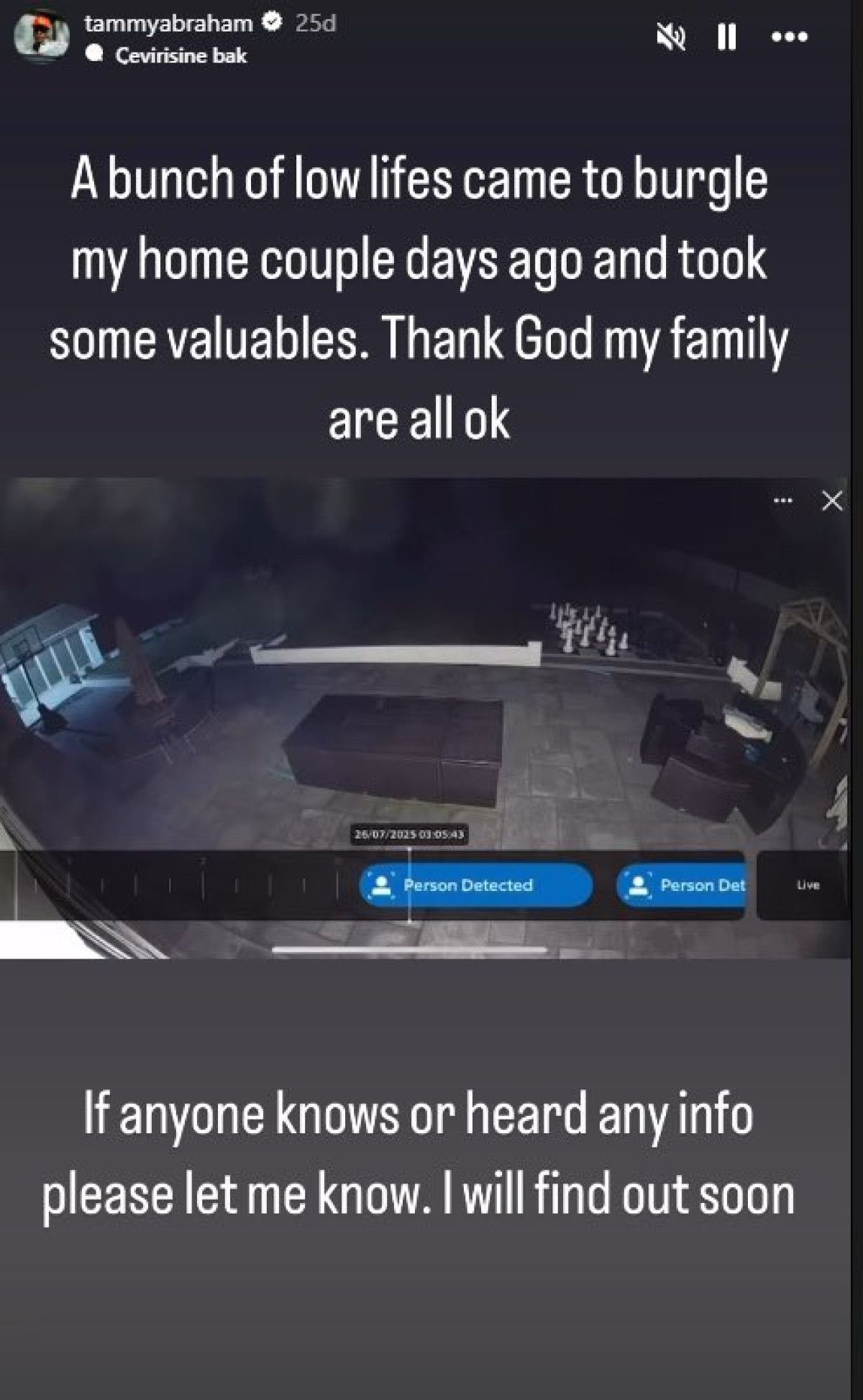“Bir küme aşağılık insan birkaç gün evvel meskenimi soymak için geldi ve birtakım kıymetli eşyaları aldı. Yaradana şükür ailem düzgün. Şayet rastgele bir bilginiz varsa ya da bir şey duyduysanız lütfen bana bildirin. Yakında ne olduğunu öğreneceğim.”