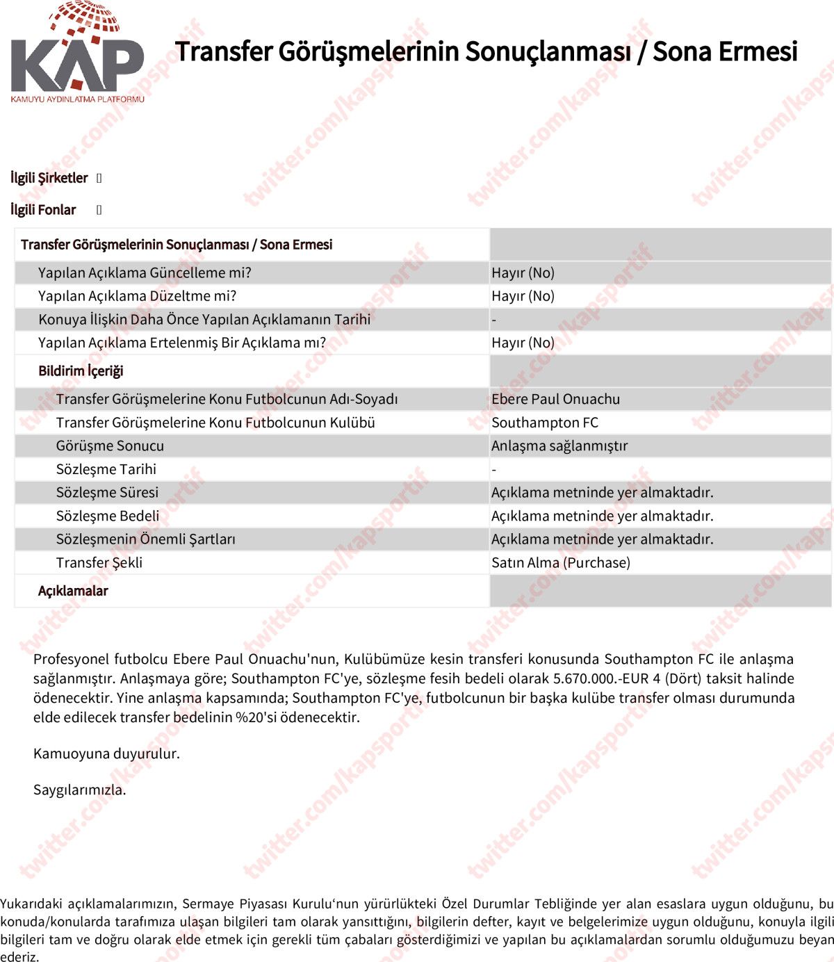 Profesyonel futbolcu Ebere Paul Onuachu’nun, Kulübümüze kesin transferi konusunda Southampton FC ile mutabakat sağlanmıştır. Muahedeye nazaran; Southampton FC’ye, kontrat fesih bedeli olarak 5.670.000.-EUR 4 (Dört) taksit halinde ödenecektir. Tekrar mutabakat kapsamında; Southampton FC’ye, futbolcunun bir diğer kulübe transfer olması durumunda elde edilecek transfer bedelinin %20’si ödenecektir.