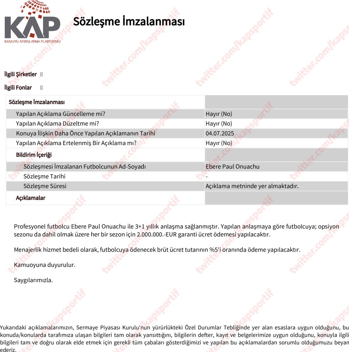 Profesyonel futbolcu Ebere Paul Onuachu ile 3+1 yıllık muahede sağlanmıştır. Yapılan mutabakata nazaran futbolcuya; opsiyon dönemi da dahil olmak üzere her bir dönem için 2.000.000.-EUR garanti fiyat ödemesi yapılacaktır.