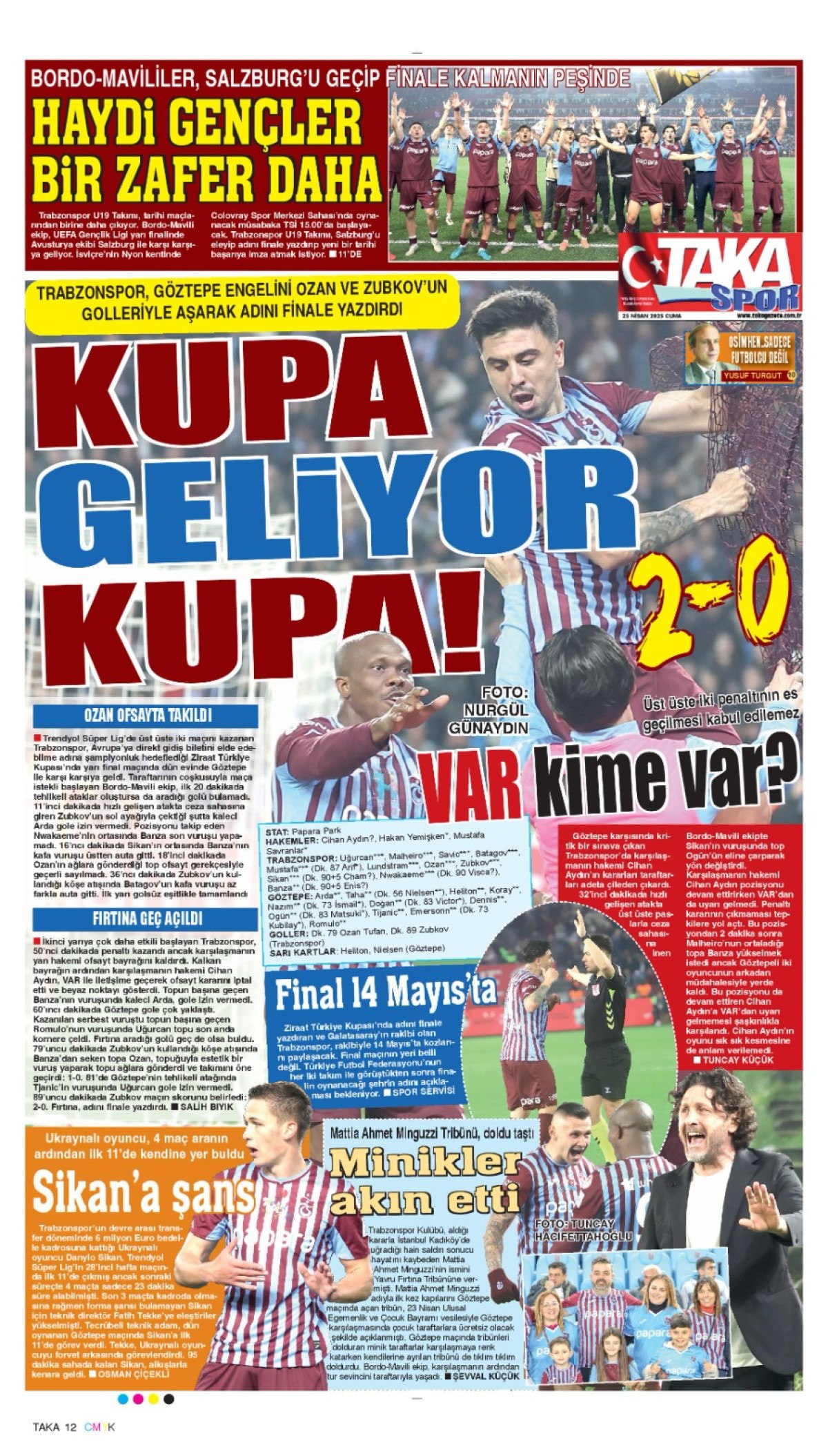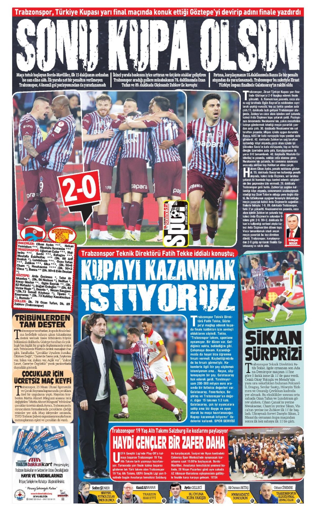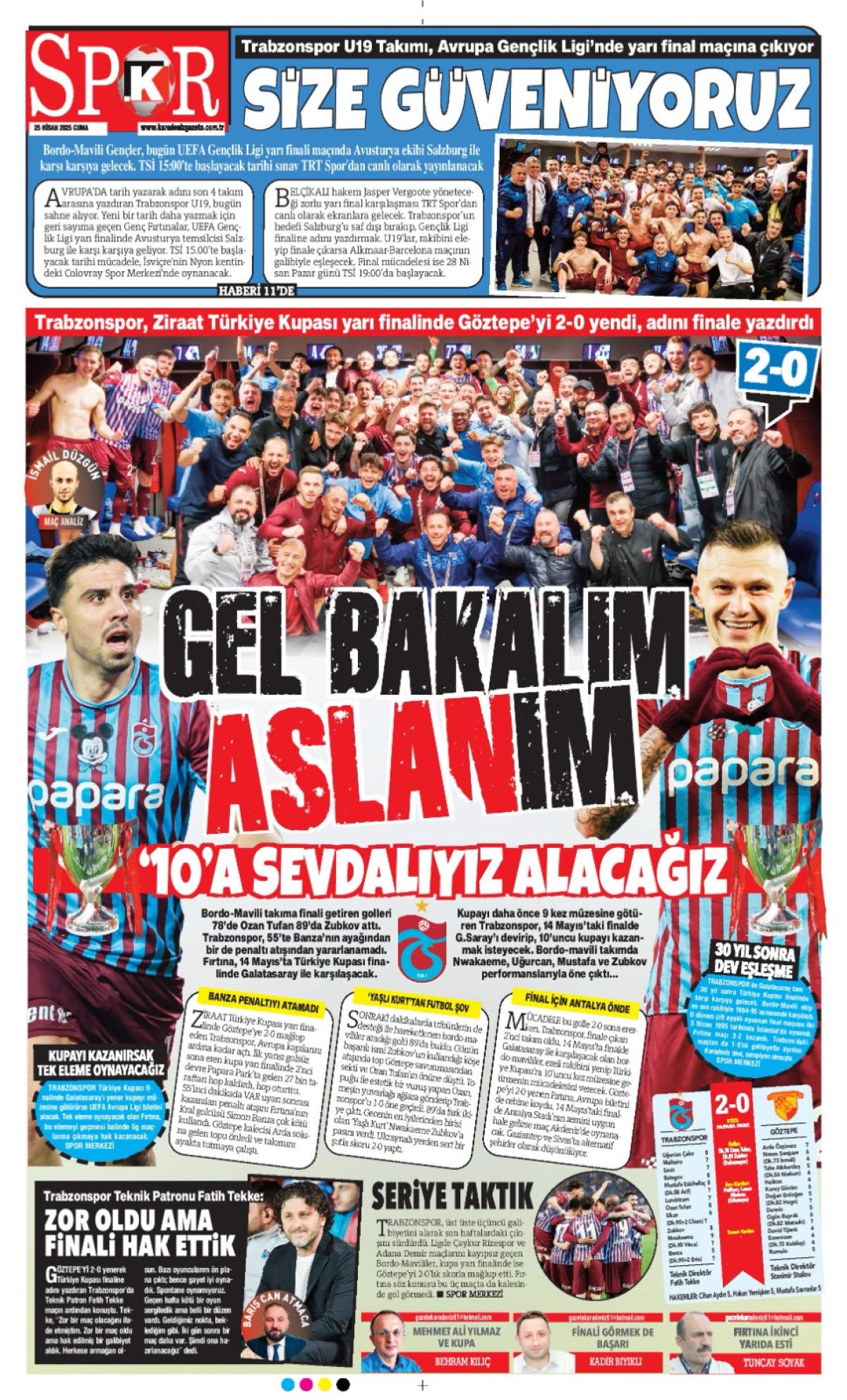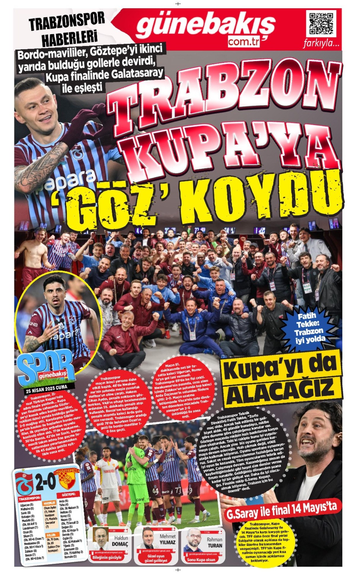 Öte yandan Trabzon’da yayın yapan yerel gazeteler de bordo-mavili takımın Göztepe’yi mağlup ederek adını finale yazdırmasını farklı başlıklarla manşetlerine taşıdı.