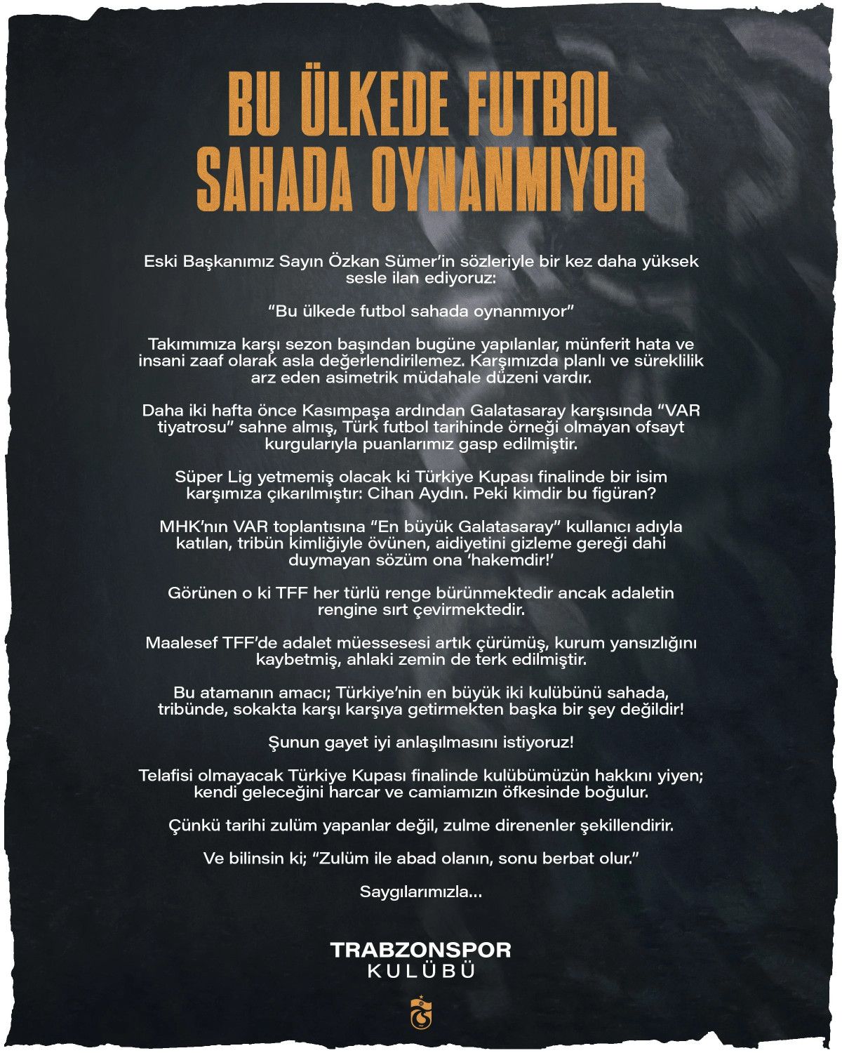 “Takımımıza karşı dönem başından bugüne yapılanlar, münferit yanılgı ve insani zaaf olarak asla bedellendirilemez. Karşımızda planlı ve süreklilik arz eden asimetrik müdahale tertibi vardır. Daha iki hafta evvel Kasımpaşa akabinde Galatasaray karşısında “VAR tiyatrosu” sahne almış, Türk futbol tarihinde örneği olmayan ofsayt kurgularıyla puanlarımız gasp edilmiştir. Süper Lig yetmemiş olacak ki Türkiye Kupası finalinde bir isim karşımıza çıkarılmıştır: Cihan Aydın. Pekala kimdir bu figüran? MHK’nın VAR toplantısına “En büyük Galatasaray” kullanıcı ismiyle katılan, tribün kimliğiyle övünen, aidiyetini gizleme gereği dahi duymayan kelamım ona ‘hakemdir!’ Görünen o ki TFF her türlü renge bürünmektedir fakat adaletin rengine sırt çevirmektedir. Maalesef TFF’de adalet kurumu artık çürümüş, kurum yansızlığını kaybetmiş, ahlaki taban de terk edilmiştir. Bu atamanın gayesi; Türkiye’nin en büyük iki kulübünü alanda, tribünde, sokakta karşı karşıya getirmekten öteki bir şey değildir! Şunun çok güzel anlaşılmasını istiyoruz! Telafisi olmayacak Türkiye Kupası finalinde kulübümüzün hakkını yiyen; kendi geleceğini harcar ve topluluğumuzun öfkesinde boğulur. Zira tarihi zulüm yapanlar değil, zulme direnenler şekillendirir. Ve bilinsin ki; “Zulüm ile abad olanın, sonu berbat olur.” Saygılarımızla…”