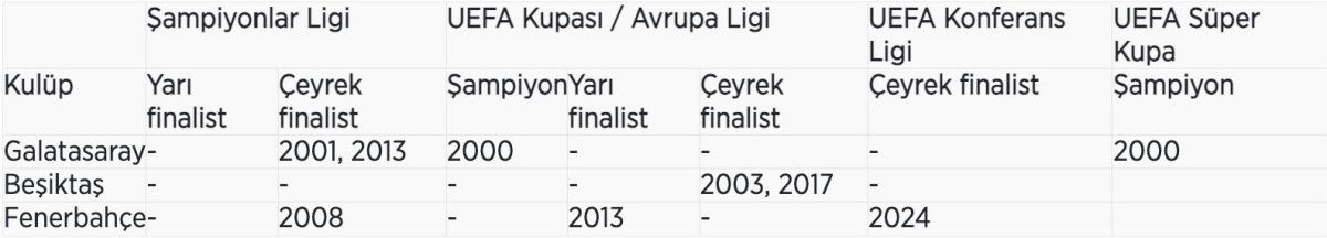 Fenerbahçe, 2013 yılında UEFA Avrupa Ligi’ne yarı finalde veda ederek kupaya en çok yaklaşan grup olurken, Beşiktaş ise 2003 ve 2017 yıllarında tıpkı tertipte çeyrek final maçlarına çıktı.
