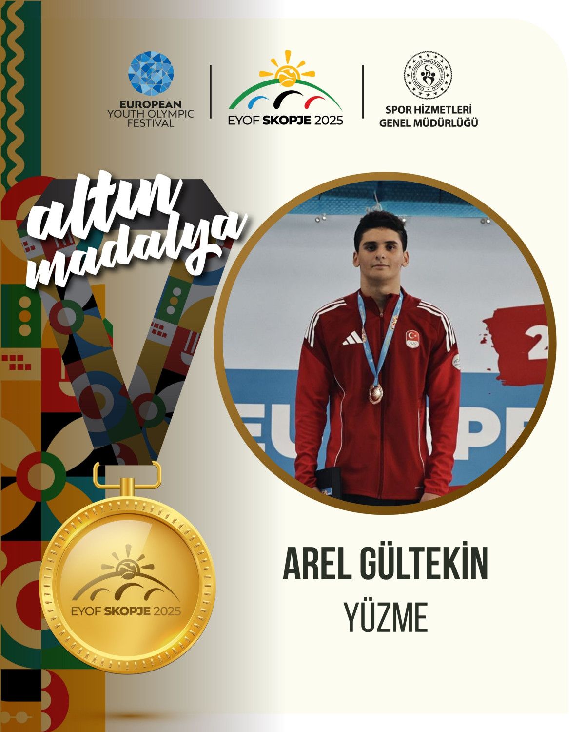 Türkiye’yi Kuzey Makedonya’nın başşehri Üsküp’te düzenlenen 18. Avrupa Gençlik Olimpik Yaz Şenliği (EYOF 2025)’nde temsil eden ulusal yüzücü Arel Gültekin, 200 metre kelebek yüzmede 2:00.33’lük derecesiyle altın madalyanın sahibi oldu.