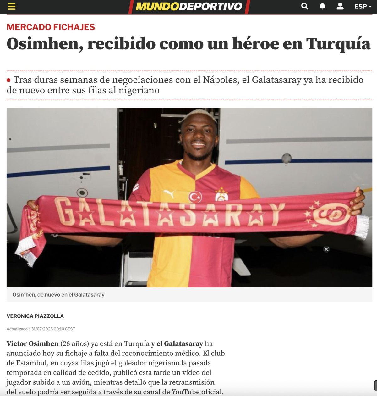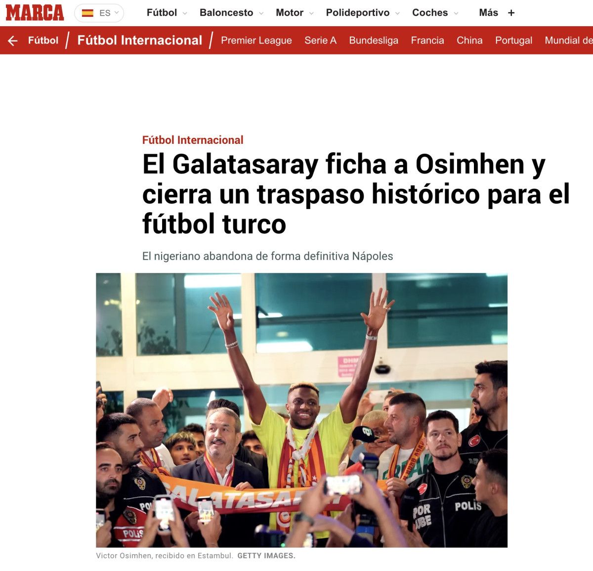 Nijeryalı forvet Victor Osimhen, Türk kulübü Galatasaray ile üç yıllık mukavele imzaladı. Yıldız isim 75 milyon Euro karşılığında Napoli’den kesin olarak ayrıldı. Öğlenden sonra İstanbul havaalanında binlerce taraftar ile karşılanan oyuncu, bu Cumartesi günü Lazio ile oynanacak hazırlık maçında (öğleden sonra 8) taraftarlara resmi olarak sunulacak.