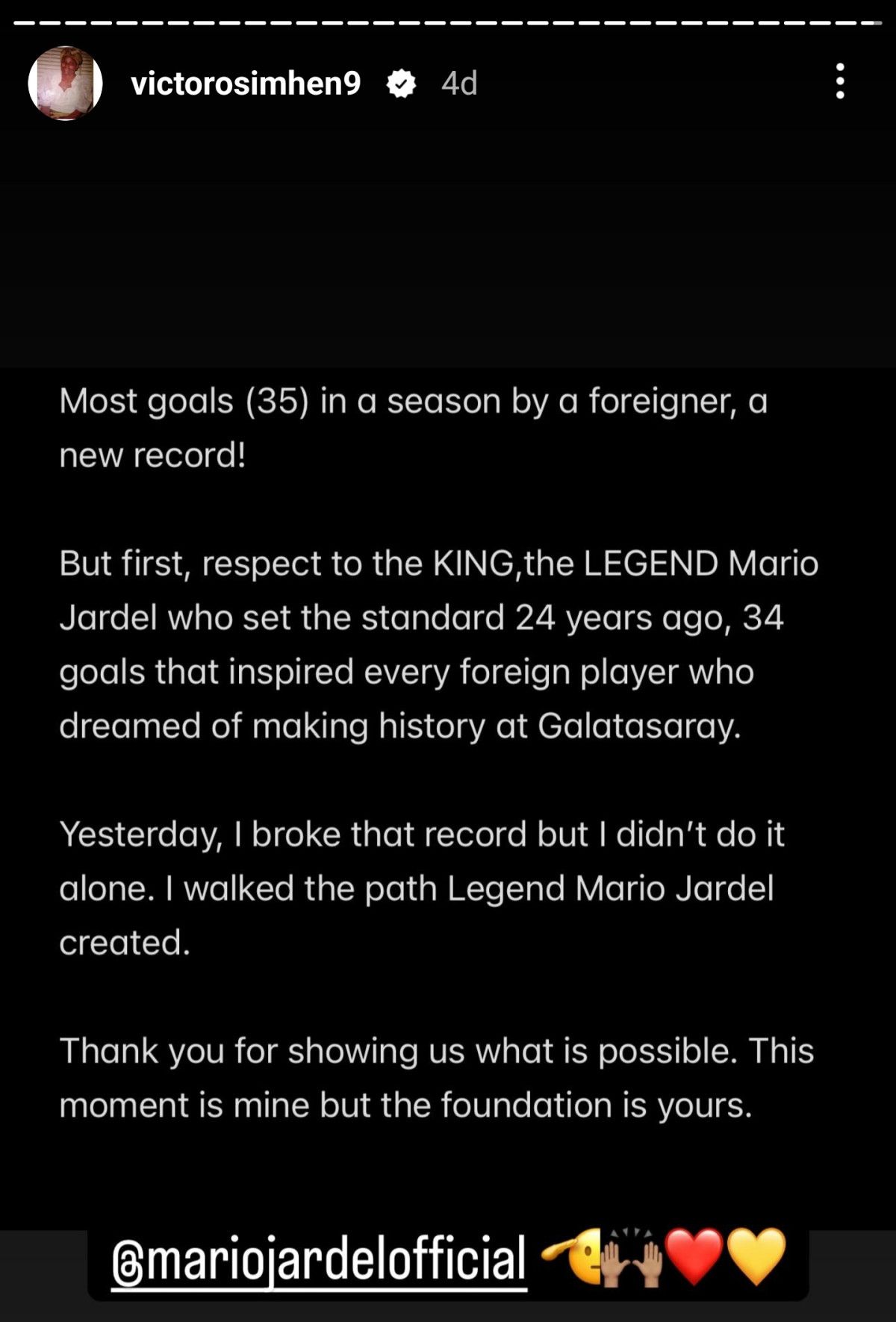 Bu muvaffakiyetin akabinde Osimhen, toplumsal medya hesabından bir paylaşıma imza attı.